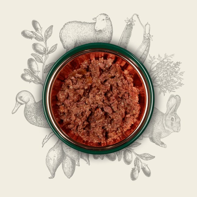Lamb 20%, Venison 20%, Duck 15%, Rabbit 15%, Broth: 26%, Vegetables: Peas 0.3%, Sweet Potato 0.2%, Carrots 0.2%, Fruits: Blueberries 0.5%, Goji Berries 0.5%, Minerals, Oils and Fats: Linseed Oil 0.2%, Botanicals: Turmeric 0.1%, MOS 0.1%, FOS 0.1%, Glucosamine 0.01%, Chondroitin 0.01%.