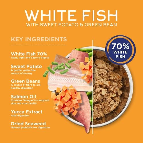 White Fish (70%), Dried Sweet Potato (1%, equivalent to 4% Sweet Potato), Green Beans (1%), Salmon Oil (0.5%), Minerals, Yucca Extract (0.05%), Dried Seaweed (0.05%).