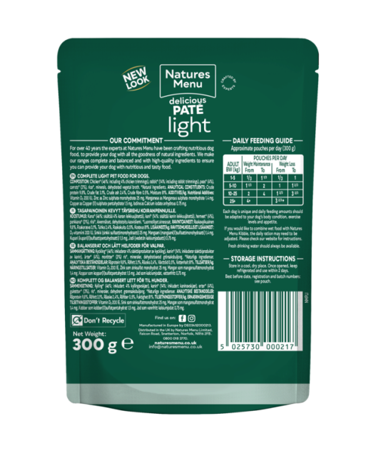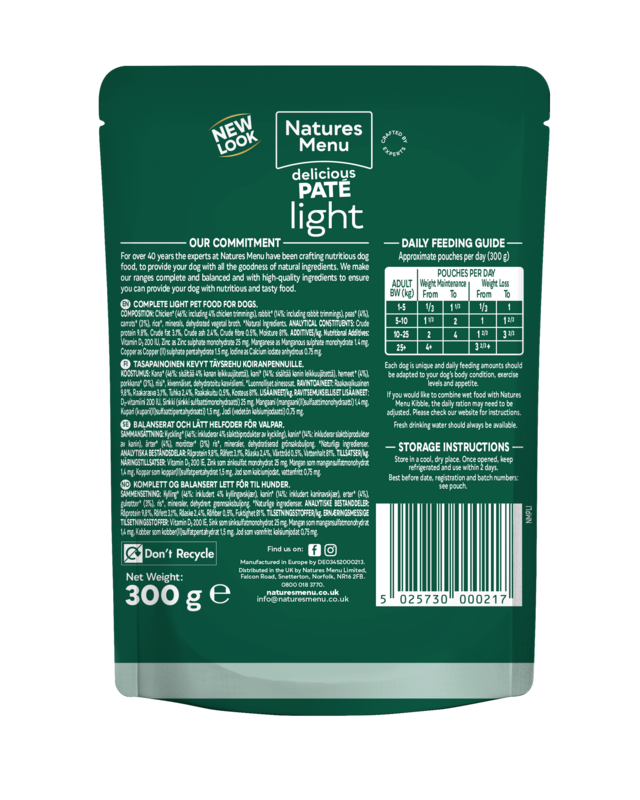 Our Light pouches are have a lower fat content that our standard pouches, and are suitable for less active dogs and those needing to lose weight.