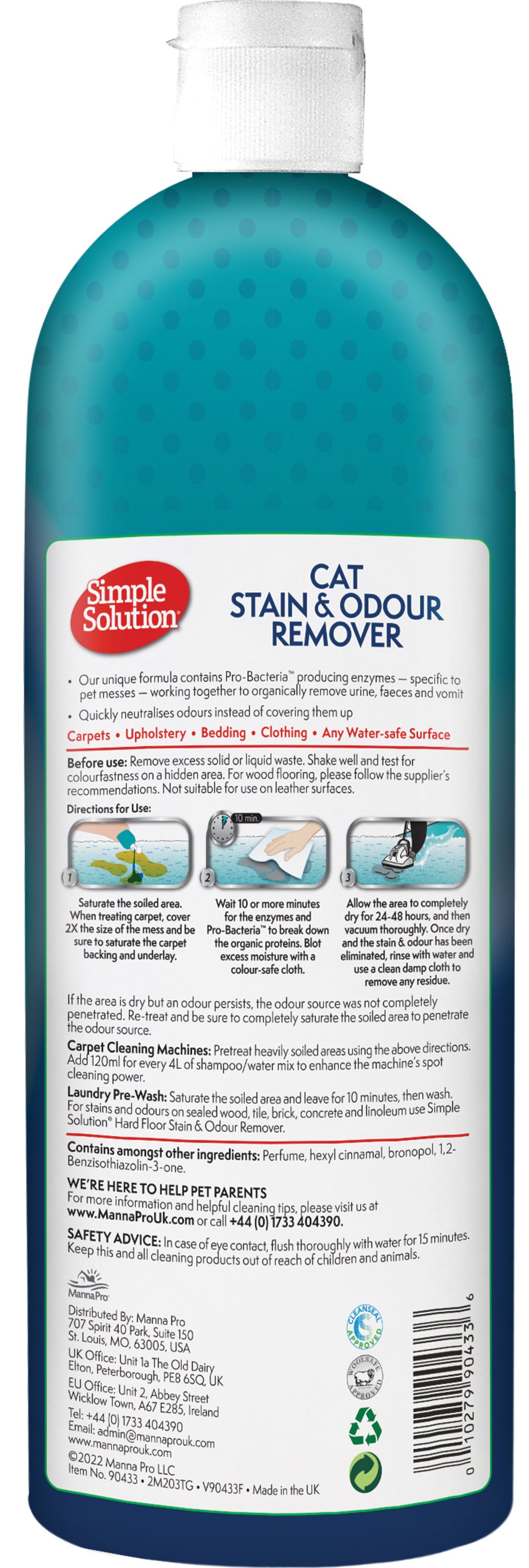 Simple Solution Cat Stain & Odour Remover is the only formula which contains both Pro-Bacteria and enzymes which effectively remove stains and odours. Simple Solution is completely safe for use around pets and children. The formula has been specifically designed to clean mess from pets such as vomit, urine and faeces, completely ridding your home of odours and discouraging pets from repeat marking. Safe for use on carpets. upholstery, bedding, clothing and any other water-safe surfaces.